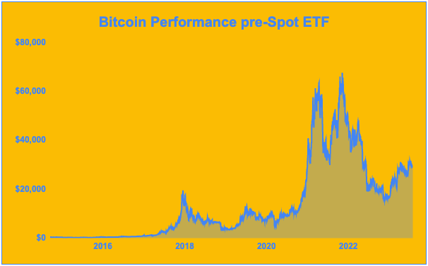 Inevitable Letdown? - Many crypto-native investors are interested in a spot Bitcoin ETF because they think that the ETF inflows will make their personal holdings appreciate dramatically. But what if the approvals never come? If you’re counting on the SEC for clear, consistent, and sensible enforcement of securities regulations then you should probably stop counting. While we think multiple spot Bitcoin ETFs are on the horizon, the SEC could easily drag this on indefinitely in the interest of “investor protection”. If that's the case we will be just fine. Bitcoin has existed and thrived for more than a decade without a spot Bitcoin ETF and it will continue to do so. Its ethos of decentralized, self-sovereign, peer-to-peer digital currency never relied on TradFi adopting it. Other scarce assets such as fine art, wine, and exotic cars, don’t have financial instruments tracking their price and they have continued to maintain their market just fine. Look at Bitcoin’s historical performance below. With or without a spot Bitcoin ETF, the show will go on.