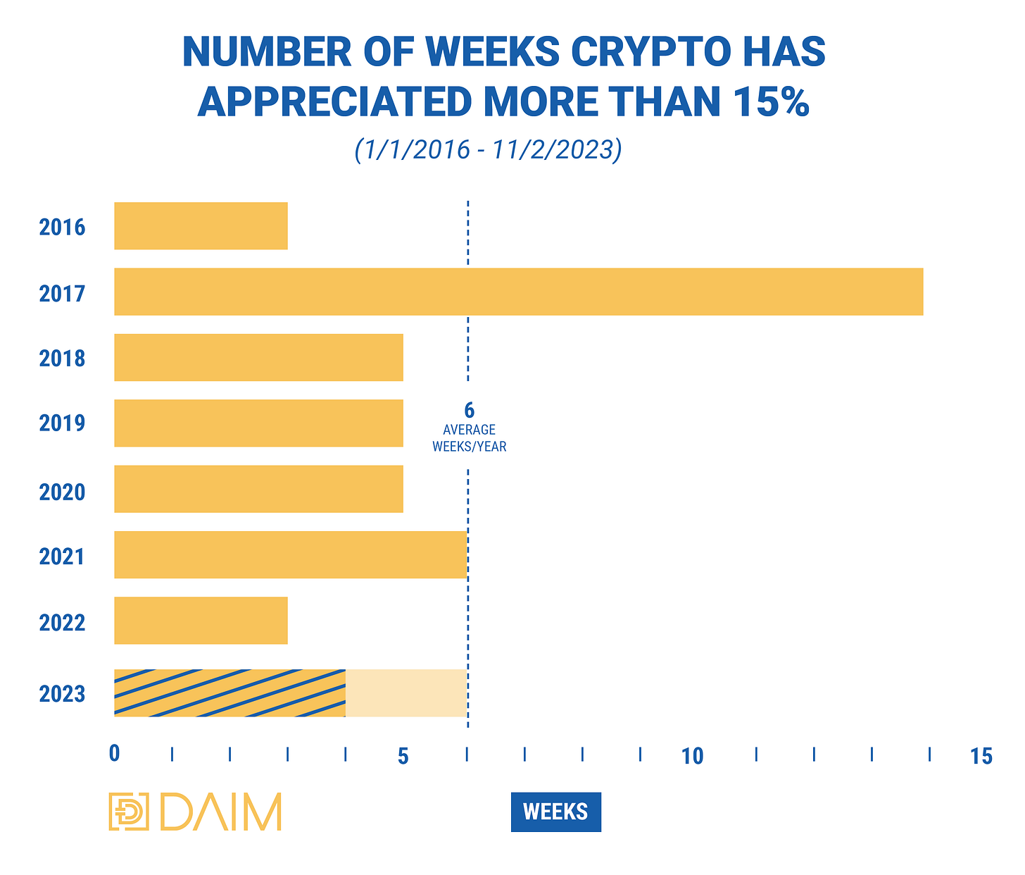 Big Weeks - It’s time to check back in on our favorite metric! Bitcoin had another Big week in October, appreciating more than 15%. As we’ve mentioned, spot ETF developments and institutional interest are in the spotlight. That seems to be driving the latest surge but as history has shown there are a myriad of catalysts that can and have generated these big weeks. As we approach the 5th halving, the likelihood of outperformance increases and we could see a meaningful uptick in big weeks. In 2021 we had 6 such weeks and in 2017 there were 15! With Tradfi primed to pour billions into the Bitcoin spot market could we see a year similar to 2017? If you have any capital to allocate, we are in a good spot based on technicals. If you can manage to stack some more sats here, your future self will thank you.