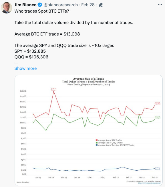 Spot Bitcoin ETFs have a ways to go to outweigh their gold counterparts. If bitcoin’s market cap was to reach gold’s, ~$13 Trillion, that would be a per bitcoin price of about $650,000. If flows are an early indication of a continued trend then that passing of the torch could happen in this decade. Look at the tweet from Jim Bianco below. Bitcoin is experiencing staggering inflows on relatively small trade sizes. That could be in part due to retail still being largely gated from buying the ETF. Vanguard, JPMorgan, Edward Jones, and more don’t allow retail clients to buy these products on their platforms. These brokerage houses are going to end up folding and eventually allowing their clients to invest in bitcoin ETFs because they don’t want to give up market share.
