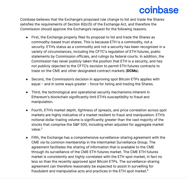 Two’s Company? The Bitcoin ETF is here. Will the Ethereum spot ETF be quick to follow? Probably not. Some proponents thought an approval would come as soon as March. We think that the ETF is coming but not until late 2024 or early 2025. Gary Gensler and the SEC dragged their feet on the Bitcoin spot ETF and they feel they have a little more ammo with respect to Ethereum. Bitcoin was always recognized as a commodity, whereas Ethereum has some distinct features that some regulators could construe as more like a security. It had an ICO, similar to a traditional IPO, it’s Proof of Stake consensus mechanism pays out rewards to stakers that is similar to a company paying dividends. And it has a figurehead, Vitalik Buterin, who resembles a CEO. The SEC could continue to argue these aspects and delay the filing, but we think the Ethereum ETF is coming. It’s hard to argue for investor protection and against the Ethereum ETF when there are leveraged single-stock ETFs. Do you think an investor is safe using a 2x product like TSLR to buy shares of a stock like Tesla, whose enigmatic CEO could sabotage shareholders on a whim? It should be up to investors to determine if the risk of an investment is worth the reward and a spot Ethereum ETF is no riskier than countless investments that retail investors have access to in their brokerage accounts. Coinbase recently put out a 27-page report arguing for Grayscale’s trust shares (ETHE) to be uplisted to an ETF. You can read the entire report here. On page three it summarizes its case which you can see below. The points are compelling which is why we think the ETF is inevitable just not imminent.