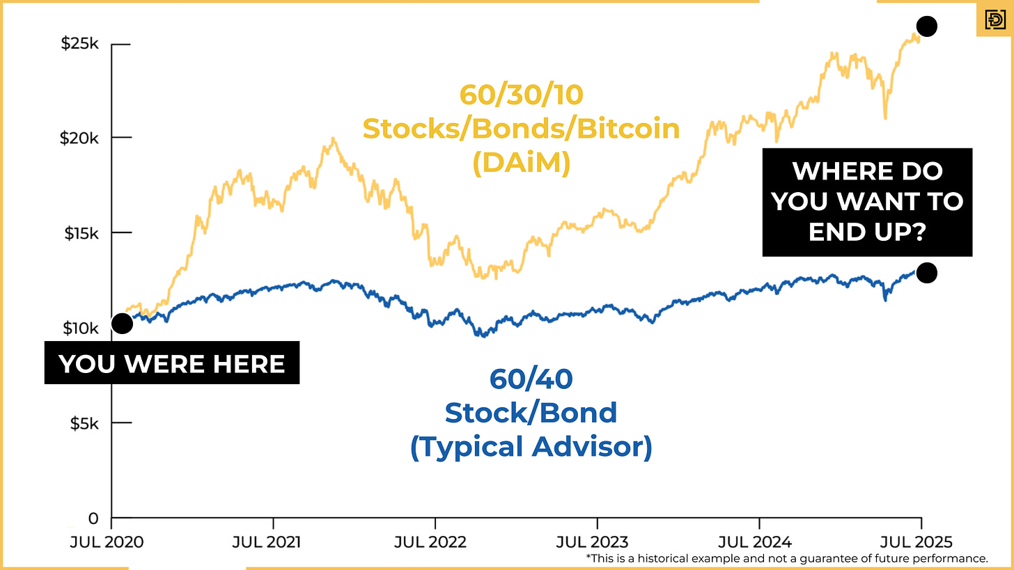 The next few years could include more head fakes, periods of stagnation, and sharp drawdowns, but they could also offer significant upside for those willing to remain patient. Our forecast has Bitcoin reaching $500,000 in 2030. This shows that in the world of bitcoin investing, time in the market matters far more than timing the market.Staying Ahead - For decades, the traditional 60/40 portfolio, 60% stocks, 40% bonds, was considered the gold standard for retirement investing. It balanced growth with stability, offering both upside and protection. But more and more investors are realizing that this formula may no longer be enough to sustain them in retirement.