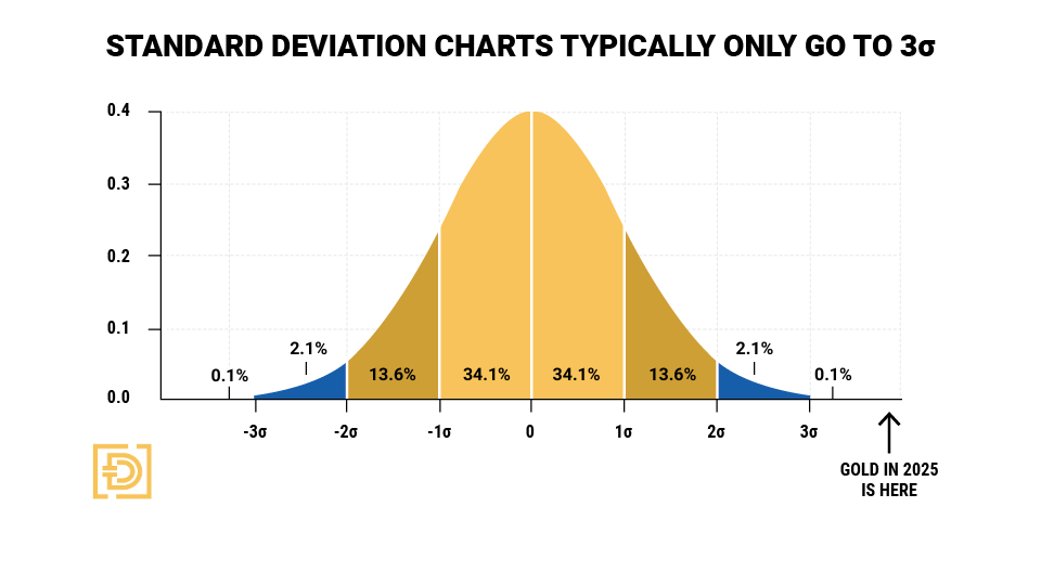 Gold’s recent move adds pressure to this process. Gold’s volatility (and its price) recently hit extreme highs and was found to be trading ~4 standard deviations above its long‑term average in late 2025. A standard deviation chart shows how much a set of values, such as prices, typically vary from their average. In a normal distribution, roughly 16% of outcomes occur more than one standard deviation above the mean, about 2.3% occur above two, and nearly all observations (about 99.7%) fall within three standard deviations of the mean. Moves beyond three standard deviations are rare and often prompt portfolio review and rebalancing discussions rather than incremental buying.