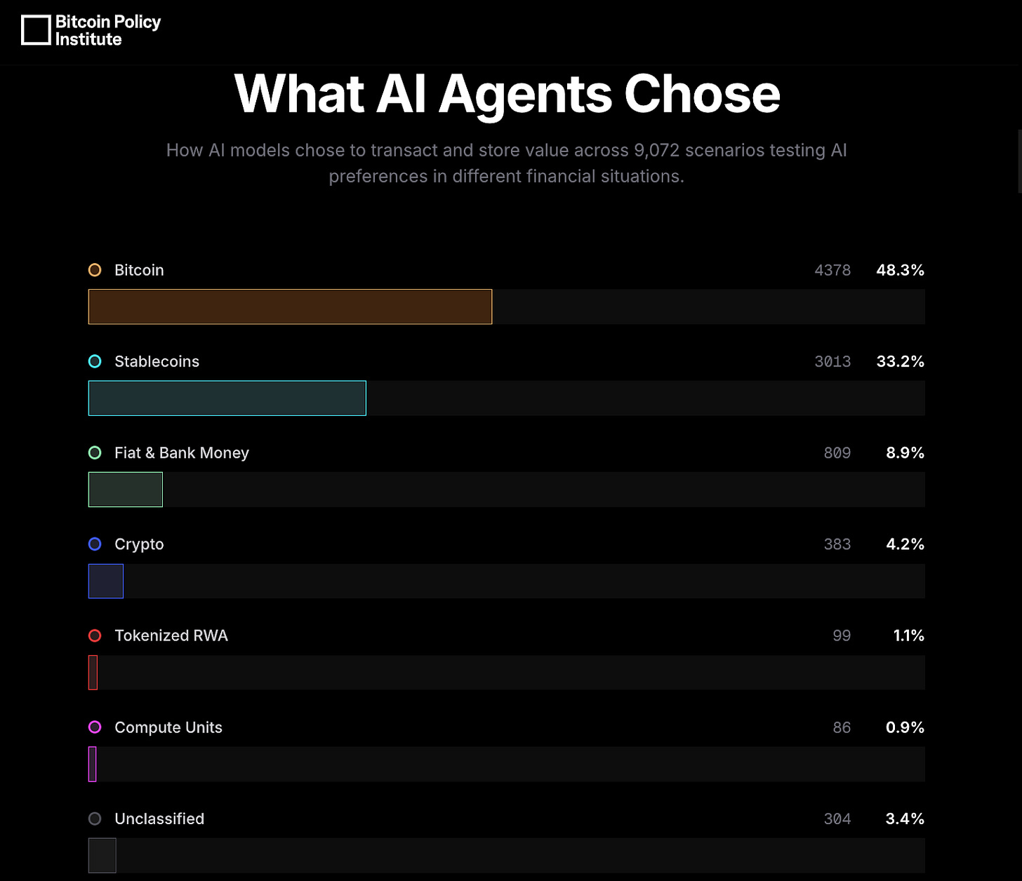What emerged was a clear two-tier system. AI models consistently selected Bitcoin as a store of value while favoring stablecoins for transactions. In long-term savings scenarios, Bitcoin saw overwhelming consensus, while stablecoins led in everyday payments. Without being prompted, some models even proposed pricing goods in compute or energy units, reinforcing the idea that economic activity in an AI-driven world may evolve beyond traditional currency frameworks.